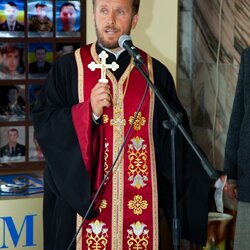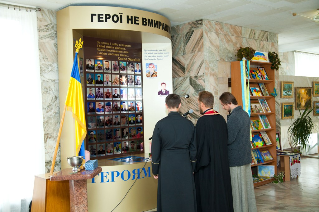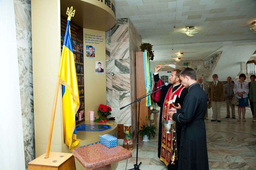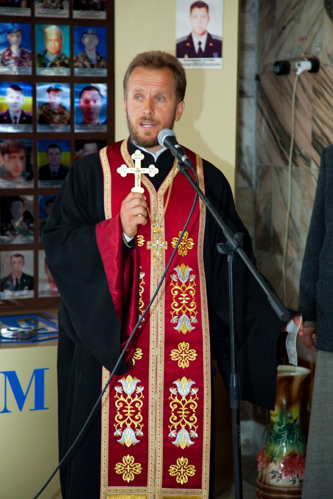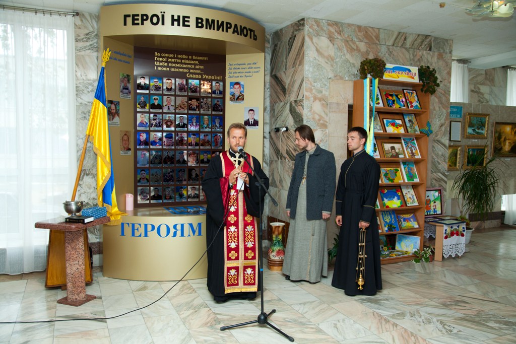 Звершив чин освячення протоієрей Іван Пукас, благочинний хмільницького благочиння парафії храму Святих Петра і Павла Української православної церкви Київського патріархату, у співслужінні протоієрея Олександра та студента київської православної богословської духовної академії Віталія Підопригори. Також була звершена заупокійна літія за воїнами АТО, "Небесною Сотнею" та усіма невинновбитими українцями.